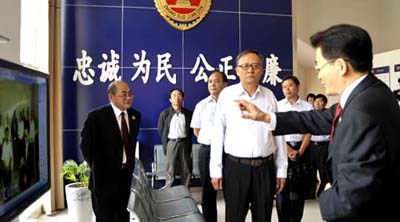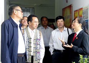 调研组参观了州中级人民法院诉讼服务中心、各部门办公室和州人民检察院远程视频接访大厅、办案工作区、预防职务犯罪警示教育厅、荣誉厅、文化长廊等,并在“两院”分别召开座谈会听取工作情况汇报。徐爱民对州“两院”卓有成效的工作,为全面推进依法治州、加快建设法治文山、深化改革跨越发展提供有力的司法保障,给予充分肯定,对州“两院”在州委的领导下,自觉和主动接受州人大及其常委会的监督表示满意。徐爱民要求,州“两院”要坚持党的领导,做到讲政治、懂规矩、守纪律,与党中央、省委、州委保持高度一致;要坚决执行宪法和法律,严格依法依程序办事;要落实好习近平总书记提出的“让民众在每个司法案件中都感到公平正义”要求,公正司法,维护正义;要高度重视司法改革,提前调研,及早准备,支持改革,适应改革,稳定队伍,安定人心;要加强队伍建设,提高法院、检察院队伍整体素质,加强反腐倡廉建设,以廉洁司法保证公正司法;要继续发扬优良传统,自觉主动接受人大及其常委会的监督。