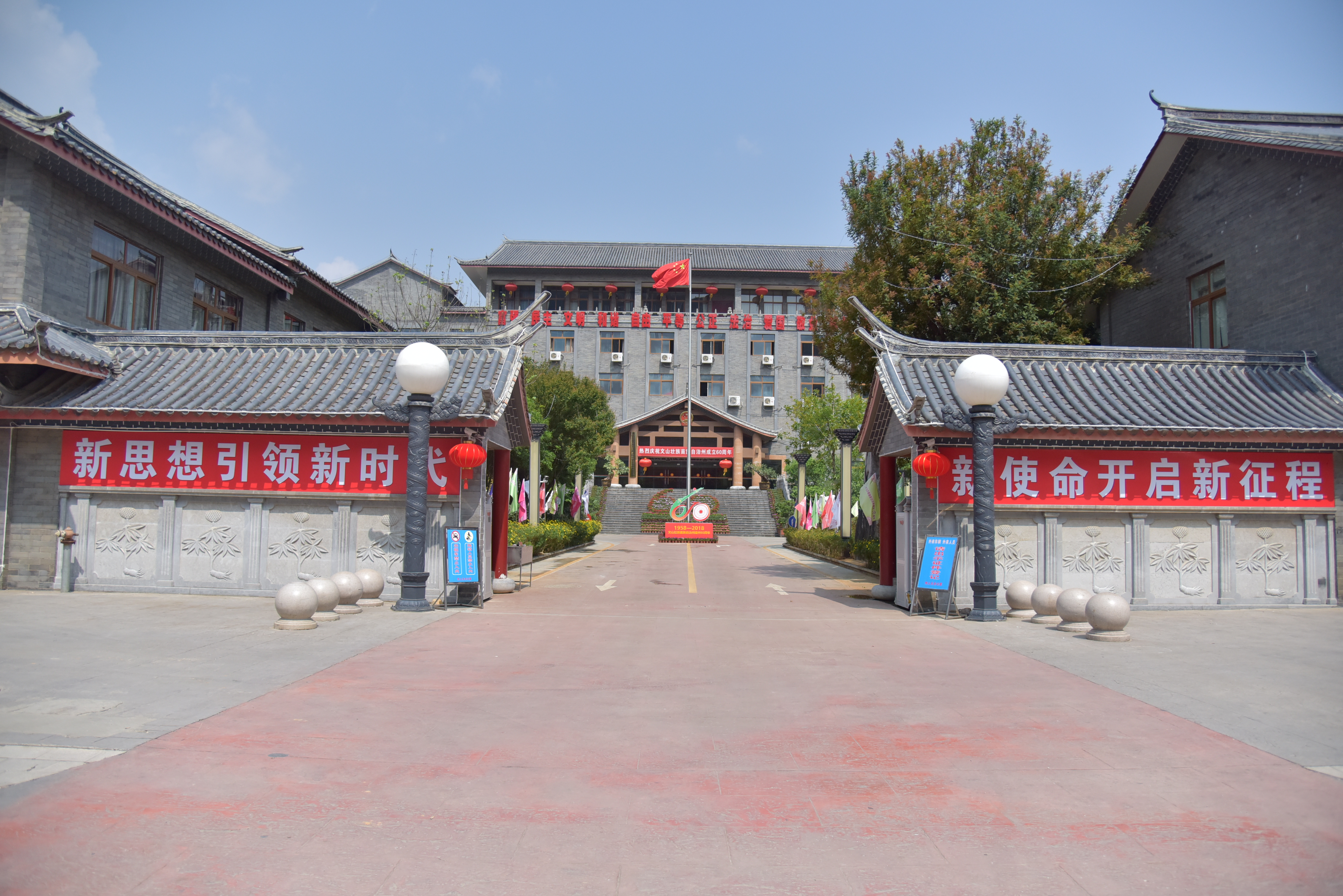 机关大院内张贴了“新思想引领新时代,新使命开启新征程”,“热烈庆祝文山壮族苗族自治州成立60周年”标语,悬挂了灯笼,安装了彩灯,布置了彩旗,摆放了“建州60周年”会徽。环境营造既突出了党的十九大精神、社会主义核心价值观、建州60周年宣传,又美化、亮化了机关环境,营造了浓厚的节日氛围。