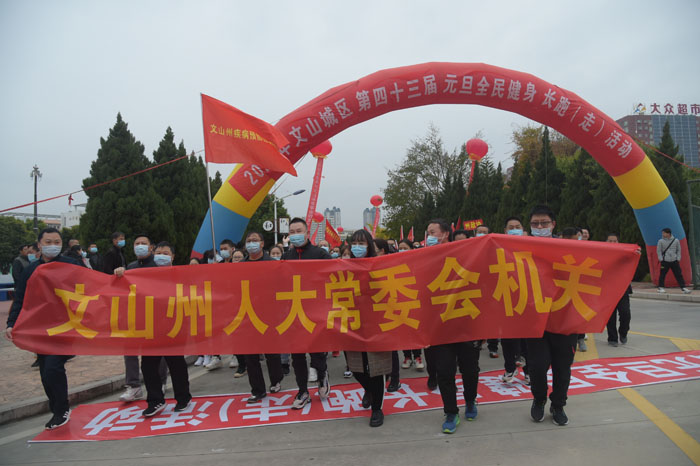 2020年12月31日上午8点30分,文山市第一高级中学校园内人声鼎沸,文山州、市各行政机关、企事业单位干部职工及文山城区部分群众在此集中,参加元旦全民健身长跑(走)活动。上午9点,随着发令枪声一响,州人大常委会机关干部职工跟随大部队途经文山市人民政府→凤凰路→文山州公安局→凤凰酒店(华龙东路),跑到文山州博物馆,全程约4公里。
