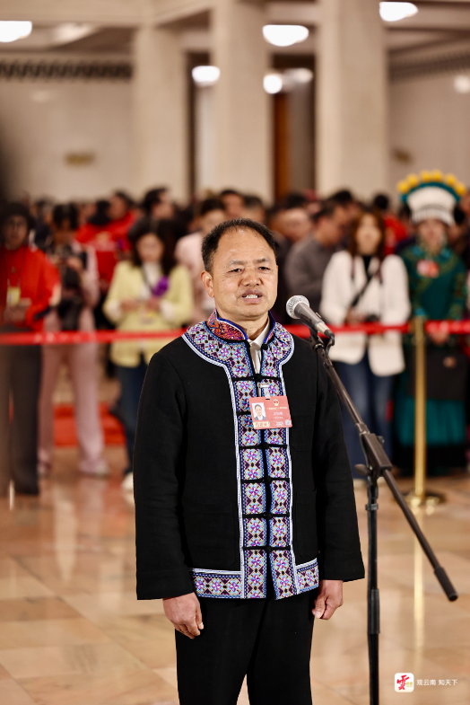 一位身着黑色壮族服饰的人大代表稳步走来,神情谦恭,目光炯炯。他是来自文山壮族苗族自治州广南县莲城镇落松地小学的教师农加贵。