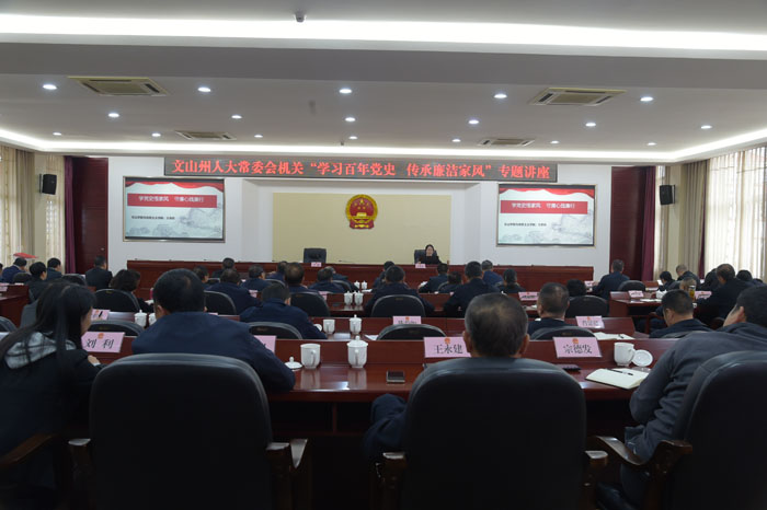 根据《州人大常委会机关2021年精神文明建设工作方案》的通知要求,结合当前正在深入开展的党史学习教育活动,10月21日,文山州人大常委会机关邀请文山学院仝杏花副教授为机关干部职工作“学习百年党史 传承廉洁家风”专题讲座。